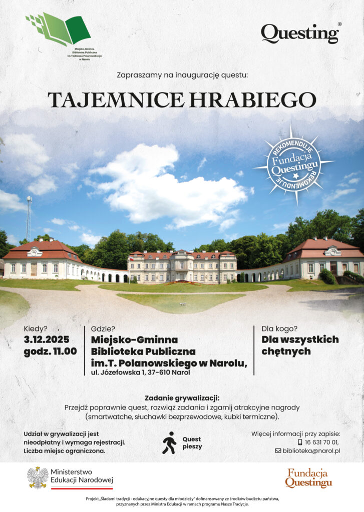 W środę, 3 grudnia, o godzinie 11:00, sprzed Miejsko-Gminnej Biblioteki Publicznej im. T. Polanowskiego w Narolu rozpocznie się inauguracja nowego questu edukacyjnego „Tajemnice Hrabiego”.