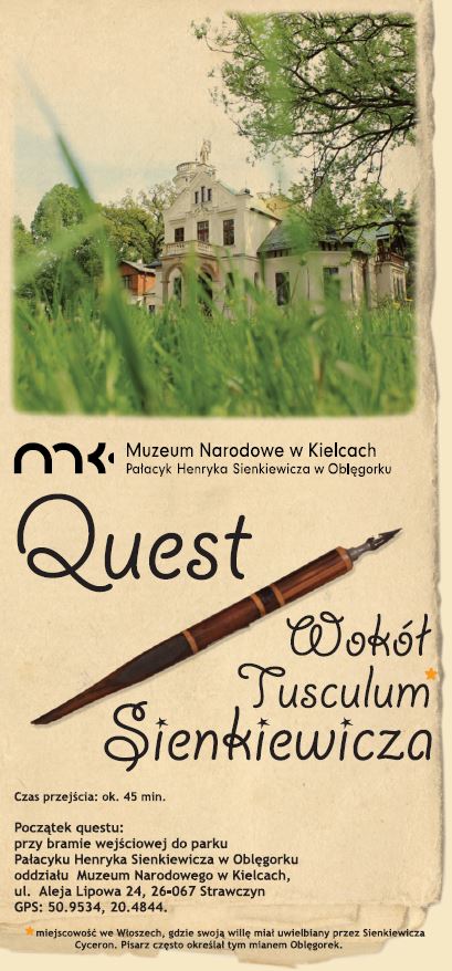 Tematyka: Quest oprowadza po malowniczej okolicy dworku Sienkiewicza w Oblęgorku, pozwalając poznać sekrety dawnych mieszkańców.