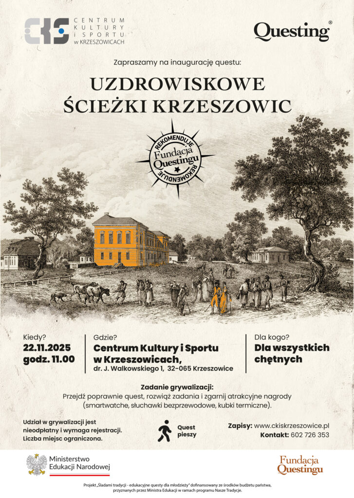 W sobotę, 22 listopada, o godzinie 11:00, w Centrum Kultury i Sportu w Krzeszowicach (dr. J. Walkowskiego 1, 32-065 Krzeszowice) rozpocznie się inauguracja nowego questu „Uzdrowiskowe ścieżki Krzeszowic”.
